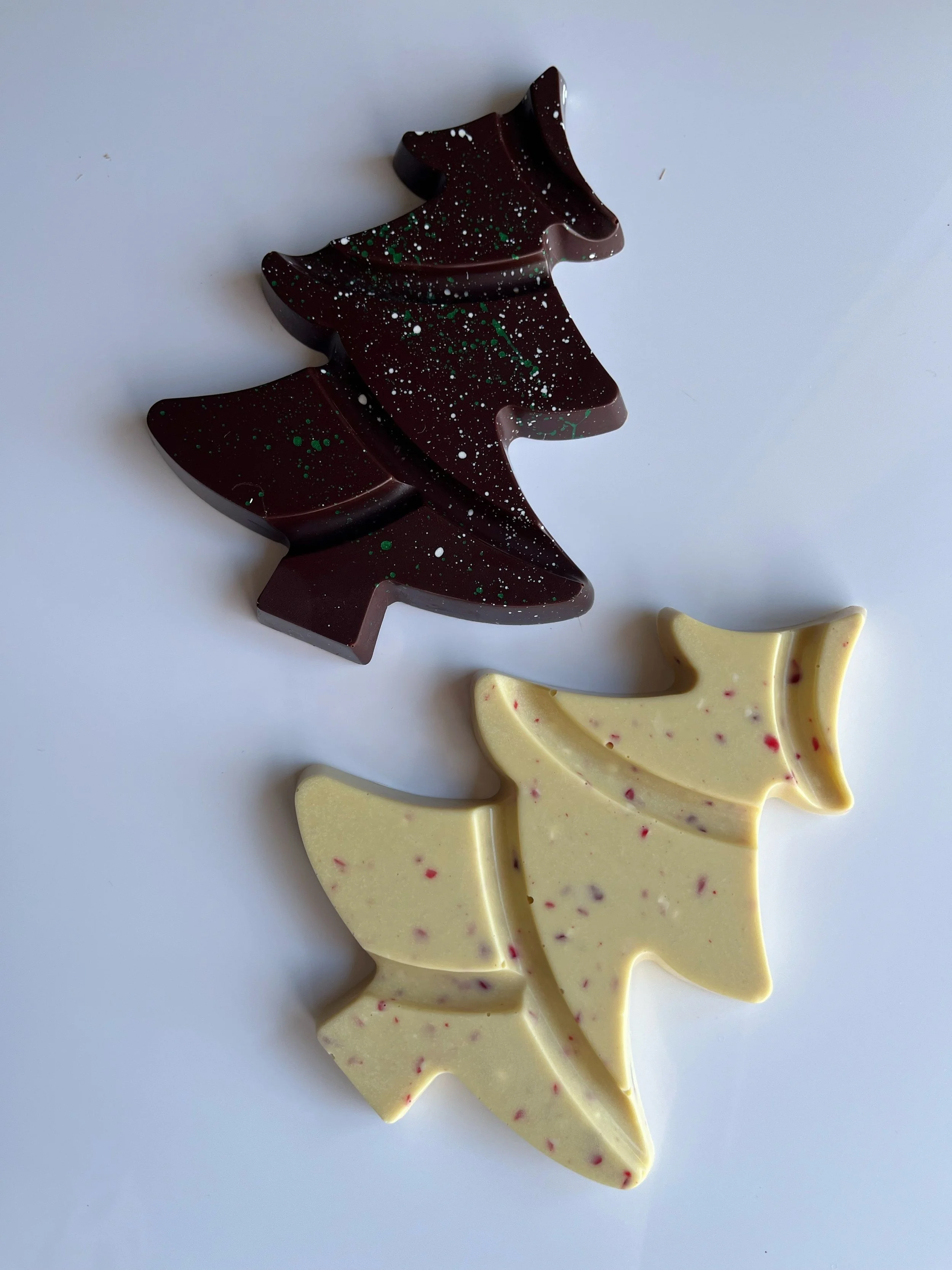Shop › Chocolate Christmas Tree Image 1 of 2 Image 2 of 2 Chocolate Christmas Tree $8.00 Solid 70% dark chocolate Christmas treeorSolid white chocolate peppermint Christmas tree Chocolate: White Chocolate Peppermint Dark Chocolate Quantity: Add To Cart Added! Solid 70% dark chocolate Christmas treeorSolid white chocolate peppermint Christmas tree